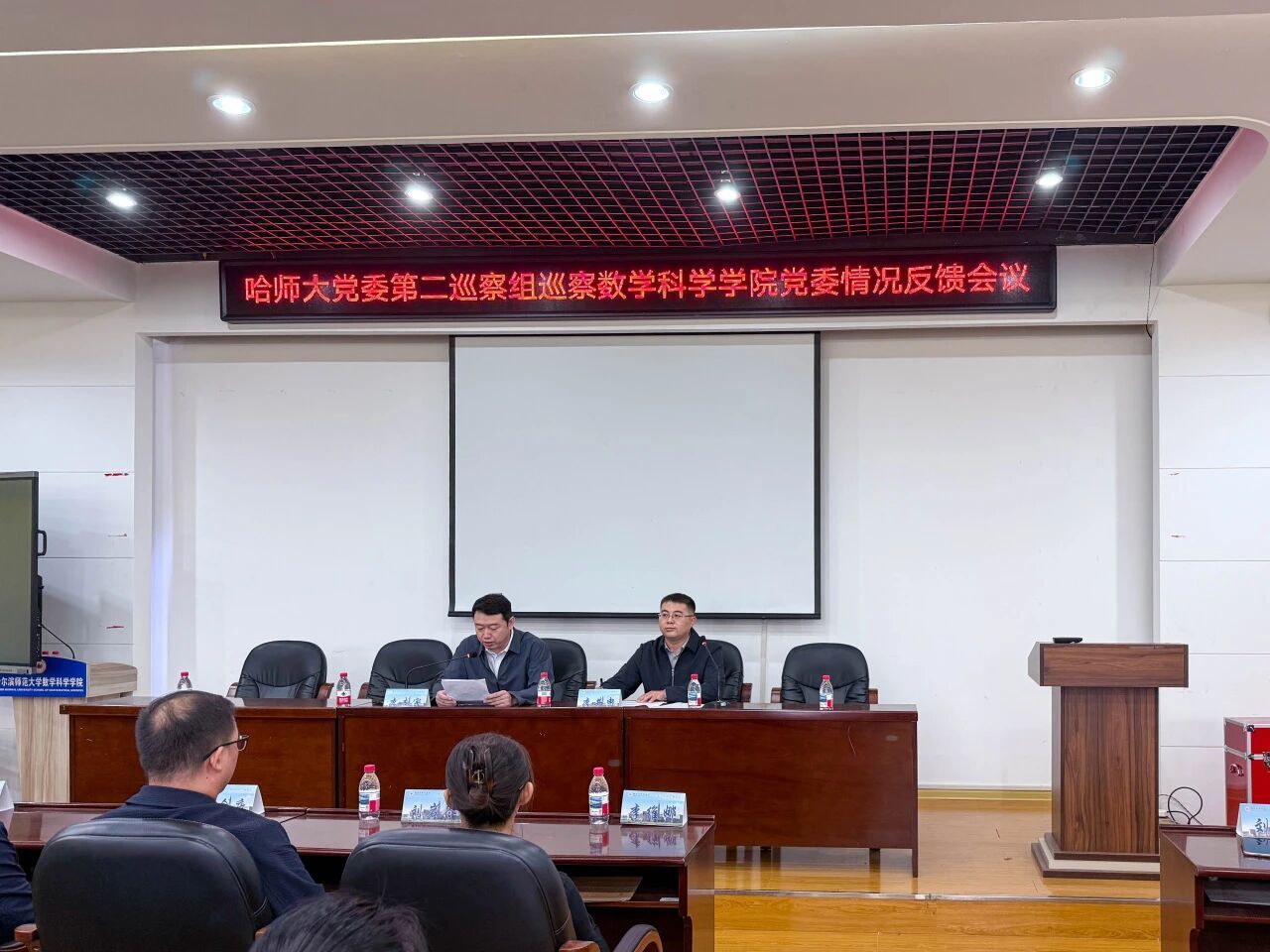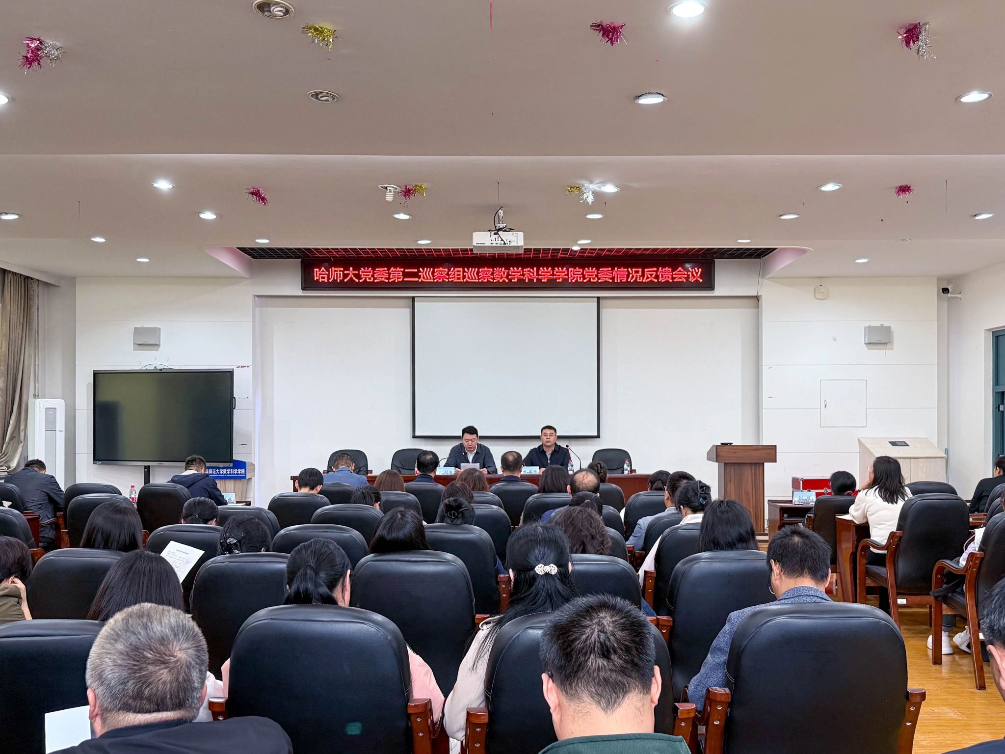 根据学校党委部署,2025年9月24日下午,学校党委第二巡察组巡察数学科学学院党委情况反馈会议在理工一号楼337会议室召开。学校党委第二巡察组组长李志宇向数学科学学院党委反馈巡察情况,提出巡察整改要求。第二巡察组副组长吕会庆、李德刚,第二巡察组成员刘岩冬、李维娜出席会议,数学科学学院全体教职工参加会议。会议由学院党委书记李井申主持。