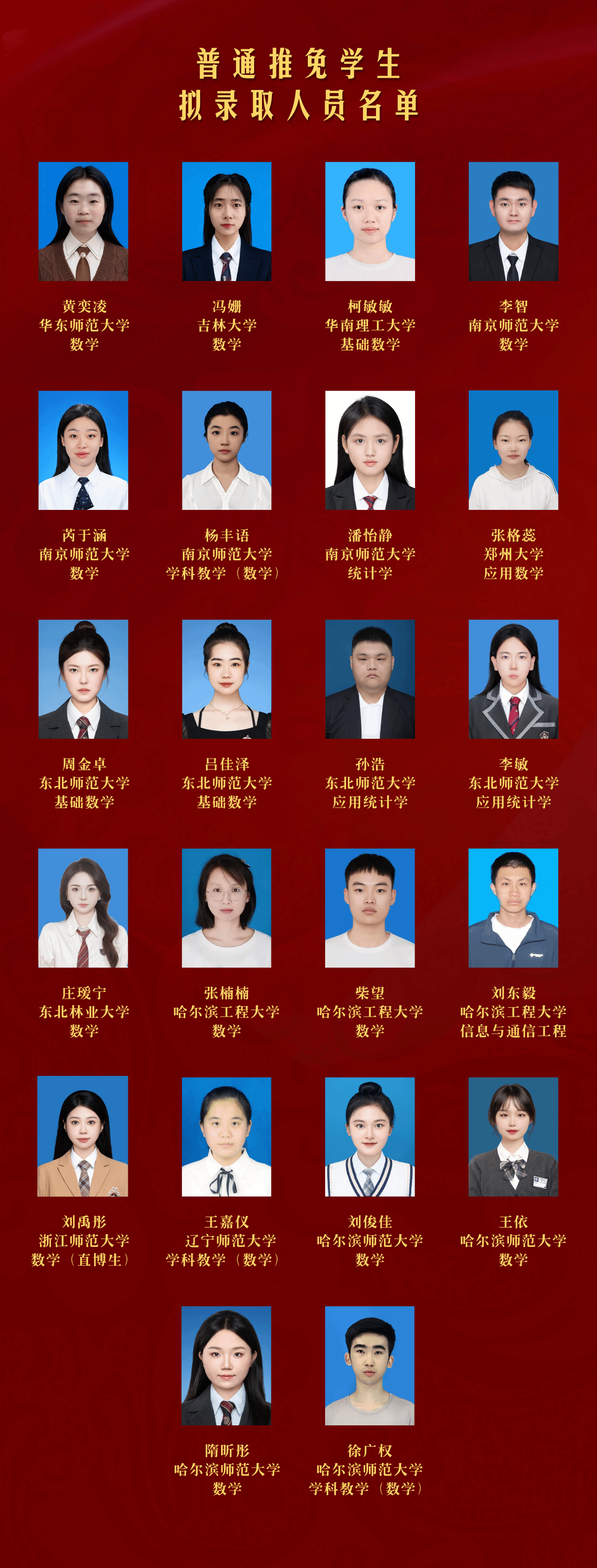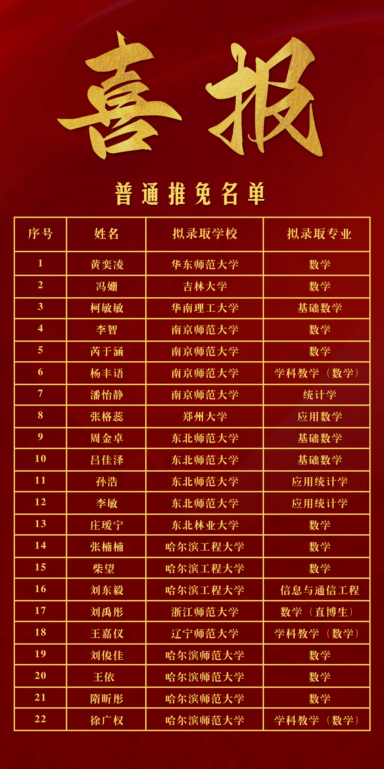 青春筑梦,扬帆起航。这29名同学即将带着学院的期望与“敦品励学,弘毅致远”的校训精神,奔赴新的求学征程。他们的奋斗故事,不仅是个人成长的勋章,更为学弟学妹们指明了方向——推免资格从不是“偶然的幸运”,而是用四年的脚踏实地、点滴积累换来的“必然结果”。希望全院学子以他们为榜样,在课堂上深耕专业、在实践中锤炼本领、在困境中保持坚韧,用勤奋与坚持书写属于自己的青春答卷。我们坚信,29名推免学子将在更广阔的学术天地中乘风破浪,在基础数学研究与交叉学科应用领域持续求索,未来成长为国家建设与民族复兴的栋梁之才。在此,向所有获得推免资格的同学致以最热烈的祝贺!愿你们心怀对数学的热忱,奔赴山海,在星辰大海般的学术世界里,寻得属于自己的璀璨星空!