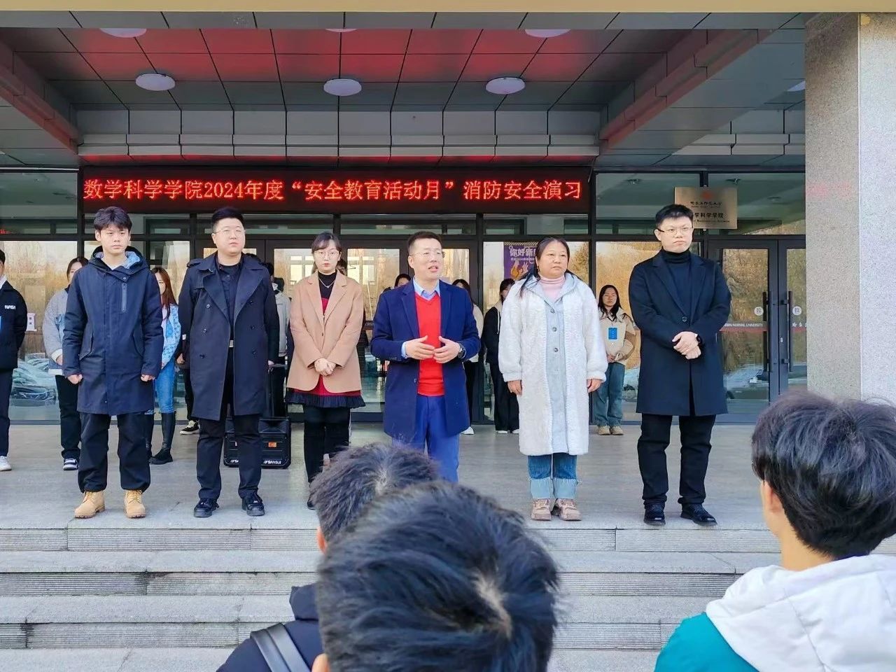为学习贯彻我校第十三届党代会精神,构建高质量安全保障体系,全面落实我校“112349”工作模式实施方案,深化实施我院“521”大学生思政工作模式,紧扣抓实安全保障的育人宗旨,根据《哈尔滨师范大学2024年秋季学期“学生安全教育活动月”活动实施方案》安排,数学科学学院于11月8日14时在理工一号楼开展消防应急疏散演习,我院党委副书记和艳民、学工办主任李斯、辅导员关鑫、张浩然、董颜溪、李艳昂出席本次活动,24级学生代表参加本次演习。
